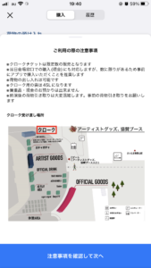 アプリで商品を購入後、表示されるQRコードをお持ちのうえ、指定された時間にオフィシャルグッズの「当日スマート受付口」までお越しください。
