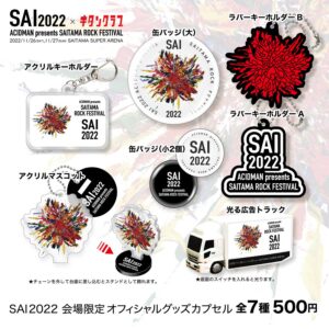 SAIのキービジュアルを使用したアクリルキーホルダーや缶バッジ、ラバーキーホルダー、そしてツアートラックをそのままミニチュア化した光るトラックの全7種がラインナップ。