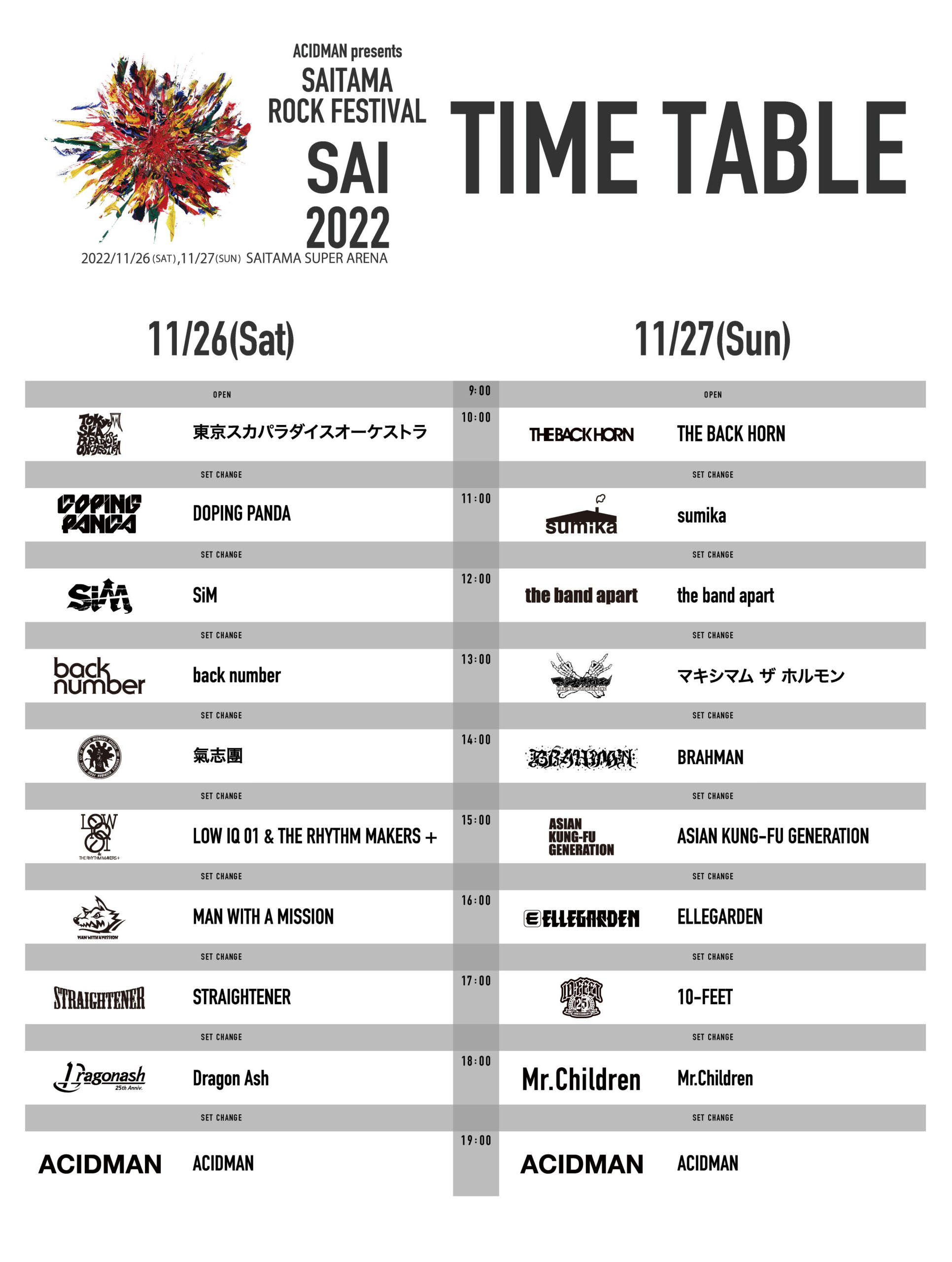 Notice: Function _load_textdomain_just_in_time was called incorrectly. Translation loading for the pods domain was triggered too early. This is usually an indicator for some code in the plugin or theme running too early. Translations should be loaded at the init action or later. Please see Debugging in WordPress for more information. (This message was added in version 6.7.0.) in /home/c3969395/public_html/stg.sai-fes.jp/wp-includes/functions.php on line 6131 TIME TABLE – ACIDMAN presents 「SAITAMA ROCK FESTIVAL “SAI” 2022」